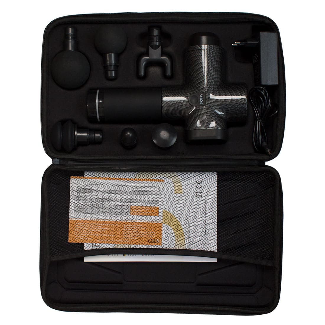 Для удобства переноски массажный пистолет, насадки и зарядное устройство находятся в компактном чемоданчике.
