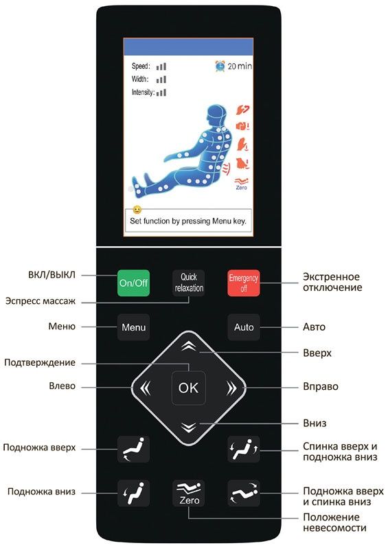 - 5 автоматических программ: восстановление, снятие напряжения, растяжение, расслабление, тонизирующий массаж.