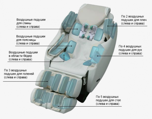 - Воздушно-компрессионный массаж всего тела. В кресле 3S массажем охватывается практически все тело. 34 воздушные подушки оказывают мягкое и аккуратное массажное воздействие. Вы можете выбрать как массаж всего тела, так и массаж отдельной области. Воздушно-компрессионный массаж позволяет улучшить кровоток в теле, особенно приток крови к конечностям.