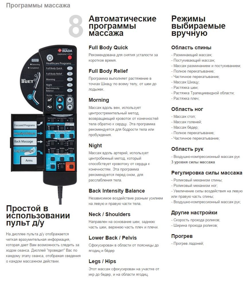 Duet от японской корпорации INADA — это поистине уникальная разработка. Верхний и нижний массажные элементы в ней действуют независимо друг от друга, обеспечивая очень глубокую проработку спинных мышцы. Подушки и ролики, расположение которых продумано японскими инженерами совместно с экспертами в области массажа, интенсивно разминают тело, воздействуя на биологические точки. Благодаря этому Вы избавляетесь от болей, чувствуете себя лучше, энергичней.