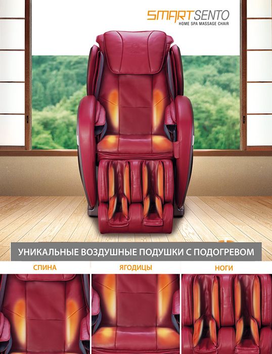 Благодаря использованию нагреваемых воздушных подушек, расположенных в области спины, бедер и икр, Вы получите ни с чем не сравнимое облегчение сознания и тела после напряженного трудового дня.