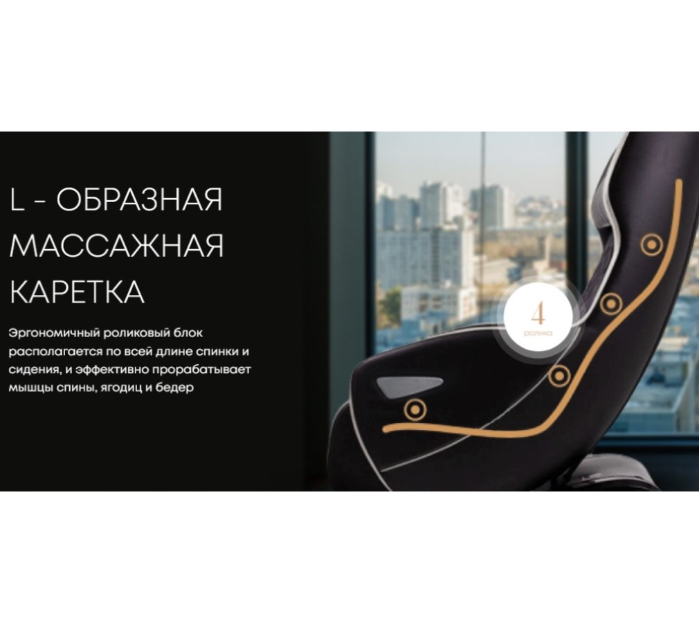 L-образная массажная каретка - оснащена эргономичным роликовым блоком, который охватывает всю спинку и сидение. Ее уникальность заключается в способности эффективно массировать мышцы спины, ягодиц и бедер.