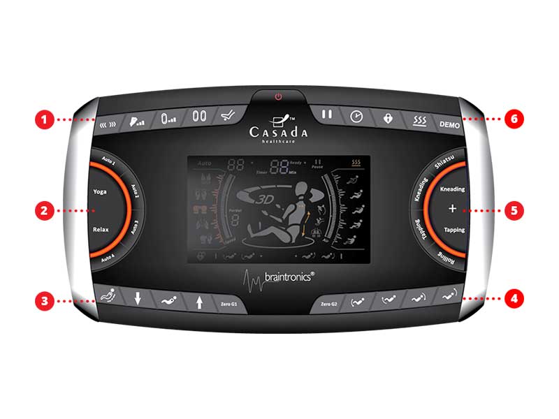 Панель управления специально разработана для кресла Hilton 3. Каждая программа и функция массажного кресла имеет собственную кнопку. Таким образом, управление креслом становится чрезвычайно простым и производится всего лишь несколькими нажатиями. А ЖК-дисплей в режиме реального времени отображает информацию о режимах работы кресла.