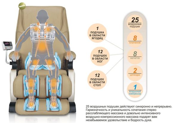 Присутствует в аппарате магнитотерапия стоп. Можно выбрать традиционный массажный режим, выполняемый при участии воздушных подушек. Их здесь 25 штук. В этом кресле они разные по своей величине и доставляют необычные приятные ощущения. С помощью этой техники массажа происходит разминание голеней, икр и стоп различными движениями: удерживанием, сжиманием, высвобождением.